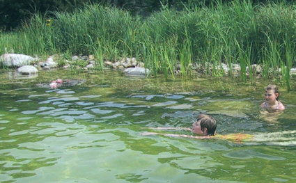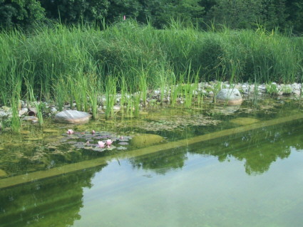 Die Trennung, zwischen der mit Pflanzen bewachsenen, natürlich gestalteten Regenerationszone und dem Schwimmbereich, besteht aus einer niedrigen, mit Holzplanken abgedeckten Mauer. Sie verhindert das Abrutschen der Vegetationsschicht in den Schwimmbereich und schafft einen Sitzplatz im Wasser.